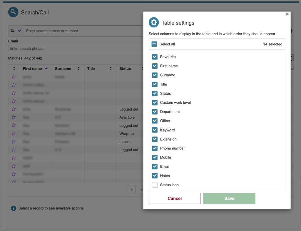 Configurable table view for matches in the Search/Call card